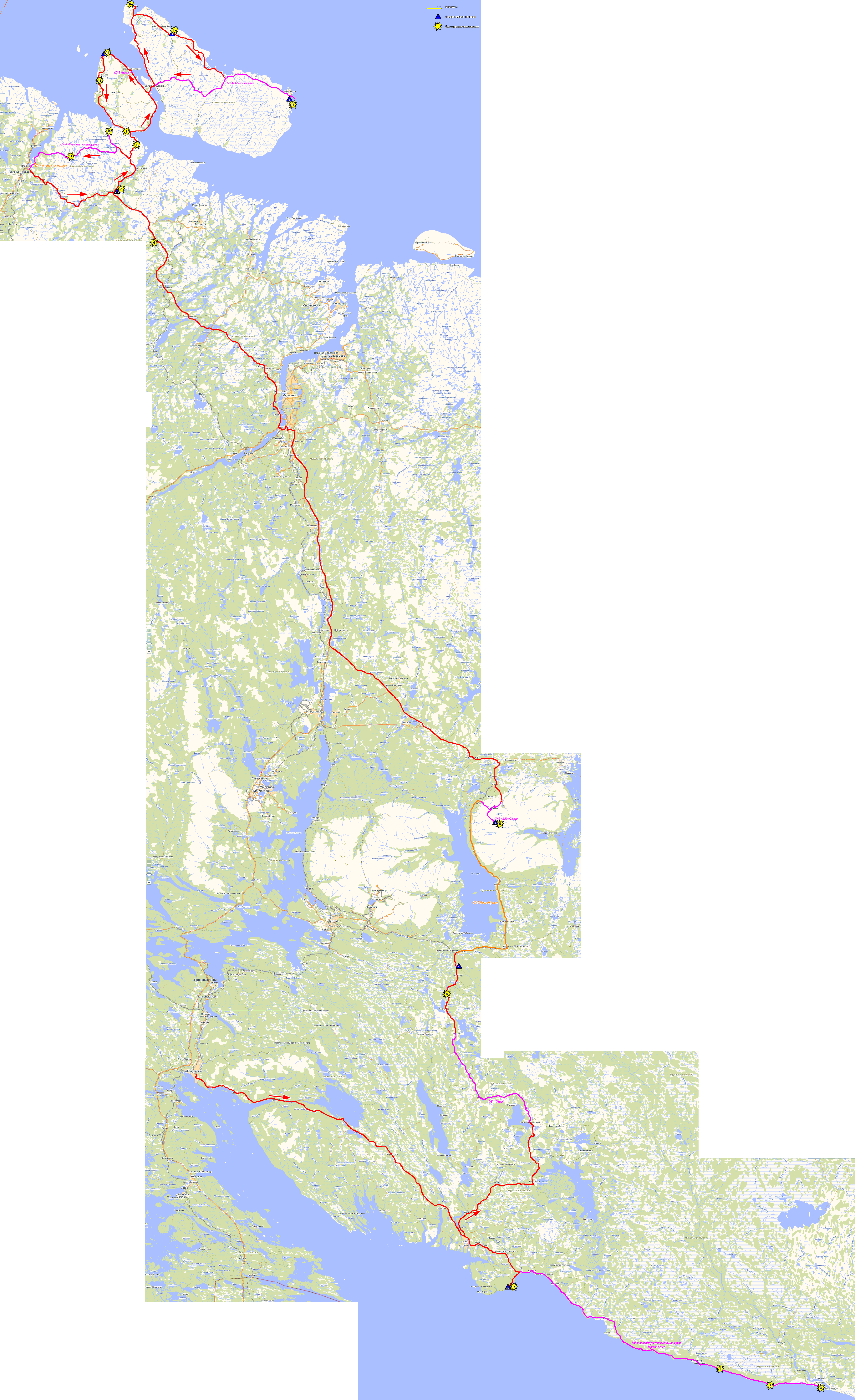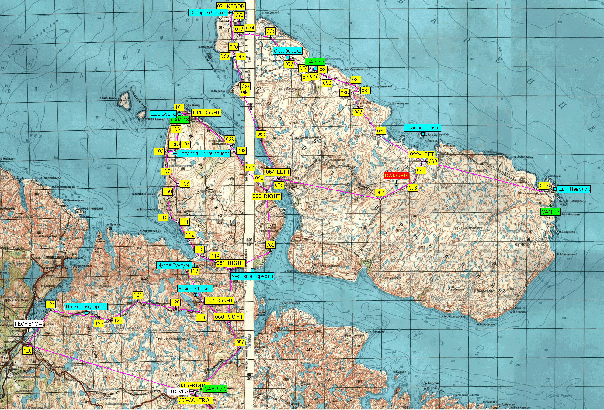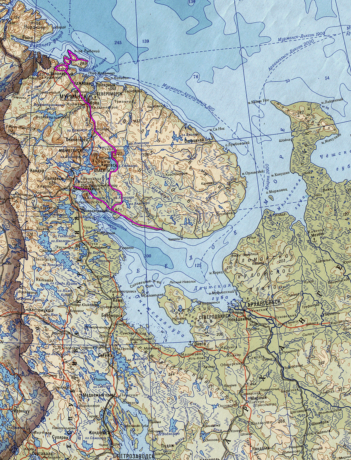 Санкт-Петербург - Кандалакша - Умба - Терский берег (Кузомень) - Восточное Мунозеро - Октябрьский - Стройка №509 - 1000 Ручьев - Перевал Геологов - г. Кедыкварпахк - Мурманск - р. Западная Лица - Титовка - Мельничный Каскад - Перевал Мустатунтури - Восточный берег п-ова Средний - Большое Озерко - западный берег п-ова Рыбачий - мыс Немецкий - Скорбеевка - Цып наволок - Большое Озерко - Западный берег п-ова Средний - Два Брата - Музей обороны МустаТунтури - Хреберт Мустатунтури - Немецкая тыловая дорога - Печенга - Титовка - Мурманск - Олонец - устье р. Тулокса - Санкт-Петербург.