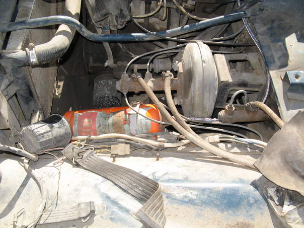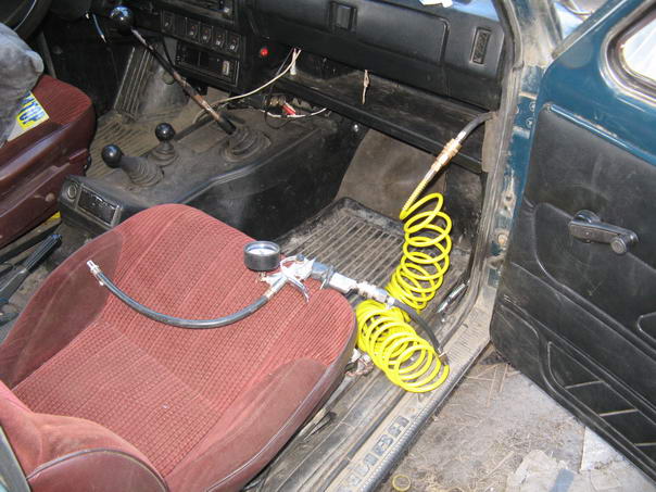 Решено было поставить ресивер. Под руку попался старый огнетушитель, который очень удачно устроился под капотом - ему не страшны не грязь не перегрев: