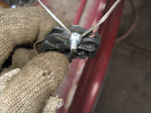 Продеваем тросик в отверстие, фиксируем резинку, предварительно смазав ее WD-40, чтобы легче влезло.