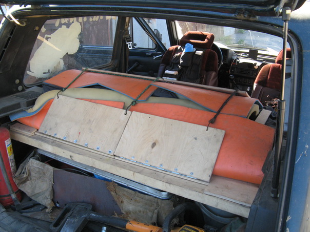 Настил решил сделать не во всю ширину, а из 3х частей. Первая шириной 60 сантиметров позволяет с комфортом спать одному при установленном сиденье для 3его пассажира (см. статью "3х местная Нива")