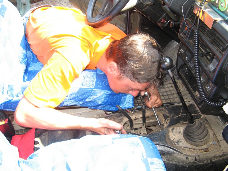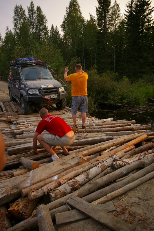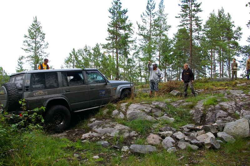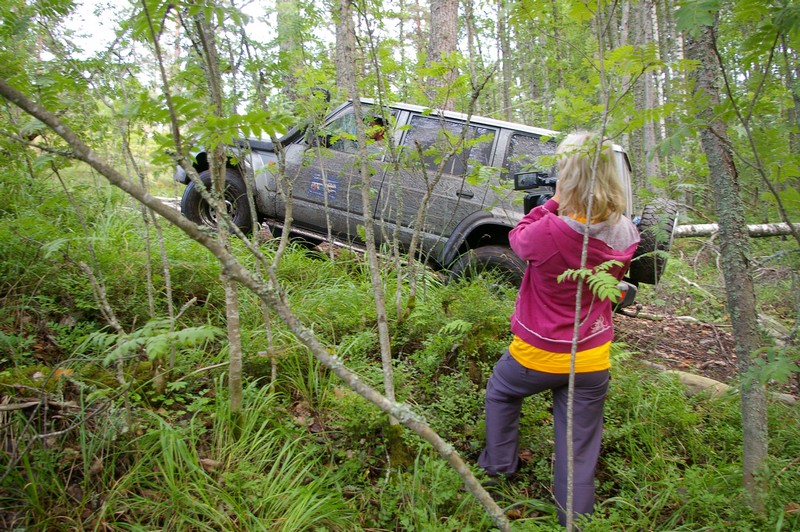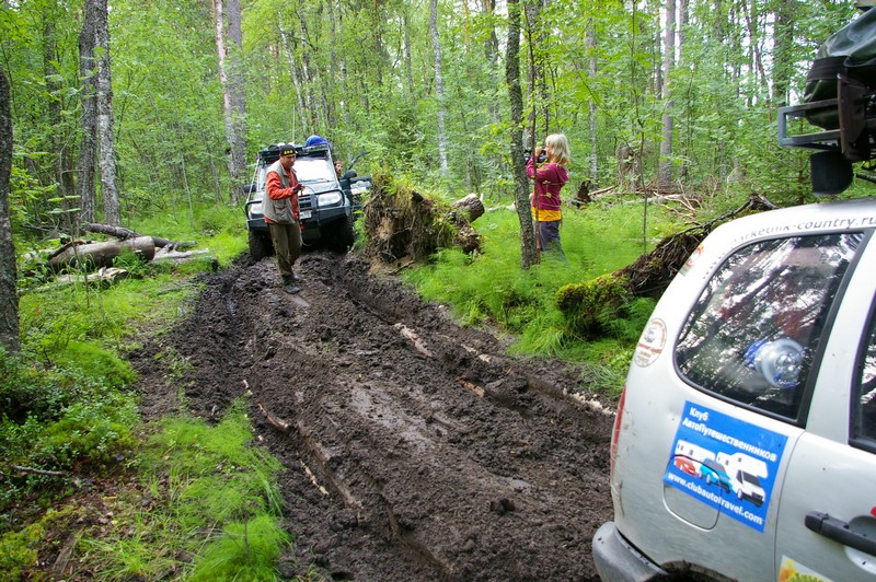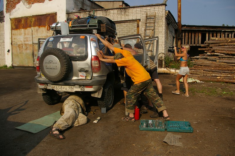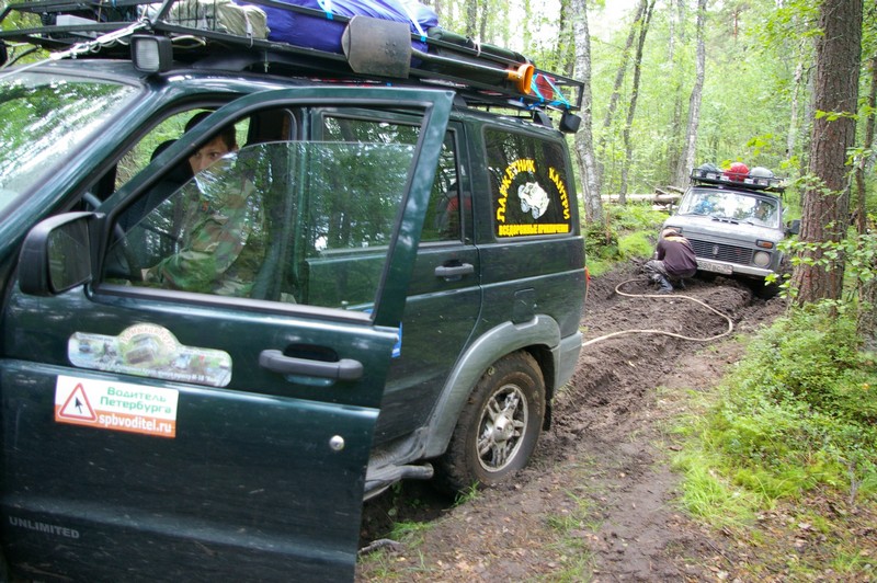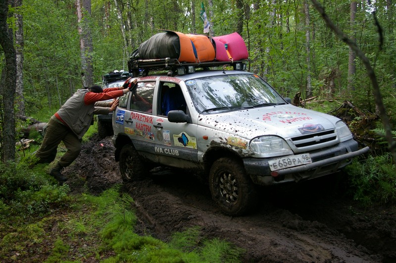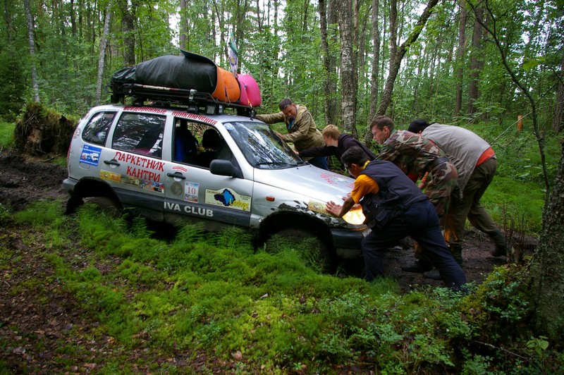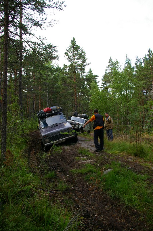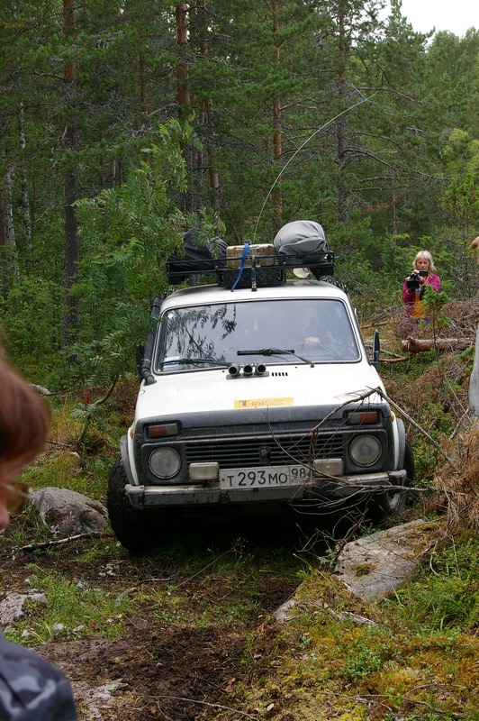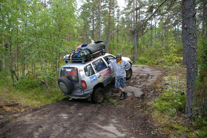 Итак, на этой дневке Александр Живицкий устанавливал антенну для радиостанции, которую не успел установить перед рейдом, а Михаил Воронов переустанавливал антенну, которую он не правильно установил перед рейдом. Ноги Сергея Таранова торчали то из машины, то под машиной - он прикручивал гайку хвостовика КПП, которая, не выдержав первый карельский грейдер, раскрутилась. Мне пришлось навести порядок на крыше - всё тяжелое переехало ближе к носу, поскольку машина имела сильный дифферент на корму. Так же производились ремонтно-наладочные работы с Ужазиком. Оптимизацией багажа и внутреннего пространства автомобилей занимались абсолютно все участники.