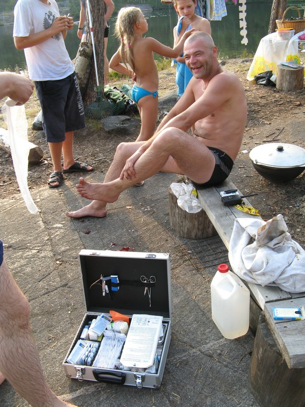К сожалению, первая дневка принесла первую серьезную травму, которая чуть не стала причиной схода с маршрута - Михаил Воронов во время купания поранил ногу (Рваная рана пятки). Ему была оказана квалифицированная медицинская помощь врачом рейда Арутюновым Александром.