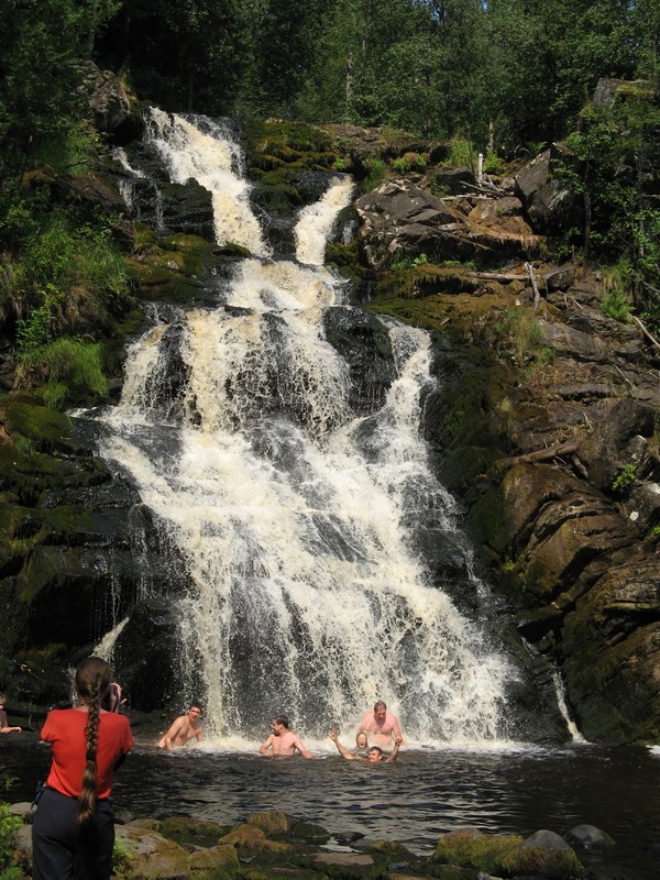 С опозданием на 15 минут от графика остальная группа покинула первый лагерь. Перемешавшись с группой велосипедистов, довольно быстро и без особых проблем преодолели спец. участок в обратном направлении; затем был заезд на АЗС перед Питкярантой и на водопад Юканкоски. Благодаря отсутствию дождей, вода в реке Кулисмайоки стала "низкой" и водопад предстал перед участниками в виде белых столбов - малыми потоками вода низвергалась с высоты прямо на головы участников, которые, конечно же, искупались. Купание получилось несколько экстремальным, температура воды в водопаде оказалась 18 градусов, при температуре воздуха в тени более 31 град.