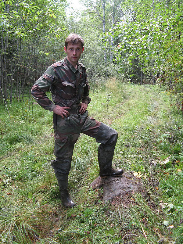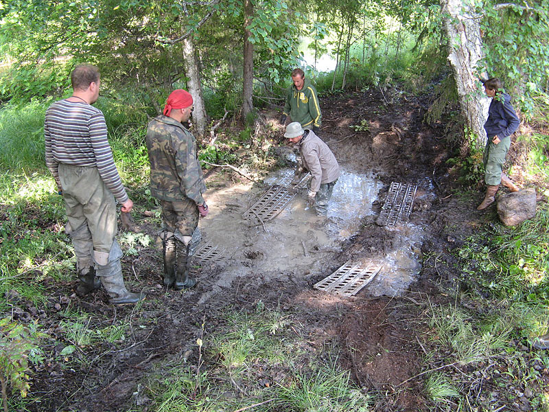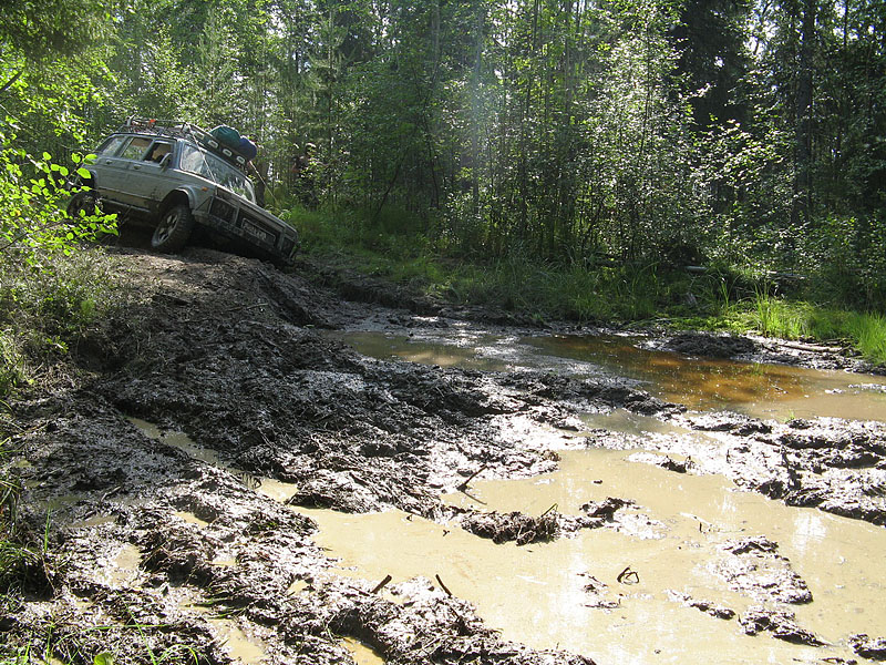 Выехали мы еще под солнце и очень бодро доехали до болота, почти без остановок, лишь под телеграфкой пришлось чуток подергать. Зато болото в обратном направлении было гораздо сложнее. Тут ночной дождь тоже внес свои коррективы. Началось все с прохождения ручья, стекающего из болота - мокрые и крутые склоны не позволяли точно попасть в траекторию: при попытке остановиться и рулить - машина просто сползала вниз, а траектория была очень сложной. Требовалось сначала свернуть с дороги налево вниз, двигаться по склону по правому краю, а в самом низу нужно было резко повернуть направо и пройти максимально близко к стоящей слева березе. Причем эта береза была еще и наклонена, надо было рассчитать так, чтобы не удариться крышей.