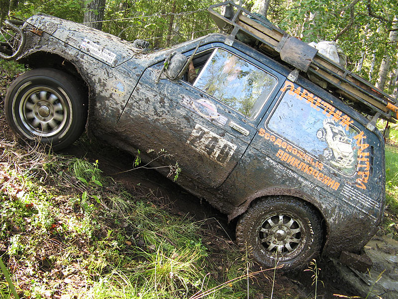 Первым пошел я, без траков. Сел, но не намертво. Катаясь взад-вперед, внизу удалось подсунуть траки. В итоге, даже удалось выехать, но подъем в горку был настолько крутым, что въехать в него без разгона не удалось. В ход пошла лебедка. Выехав, я развернулся и удобно разместился наверху. Слава богу, что Нива: на Фроське я бы тут не то что разместиться, я бы развернуться не смог!