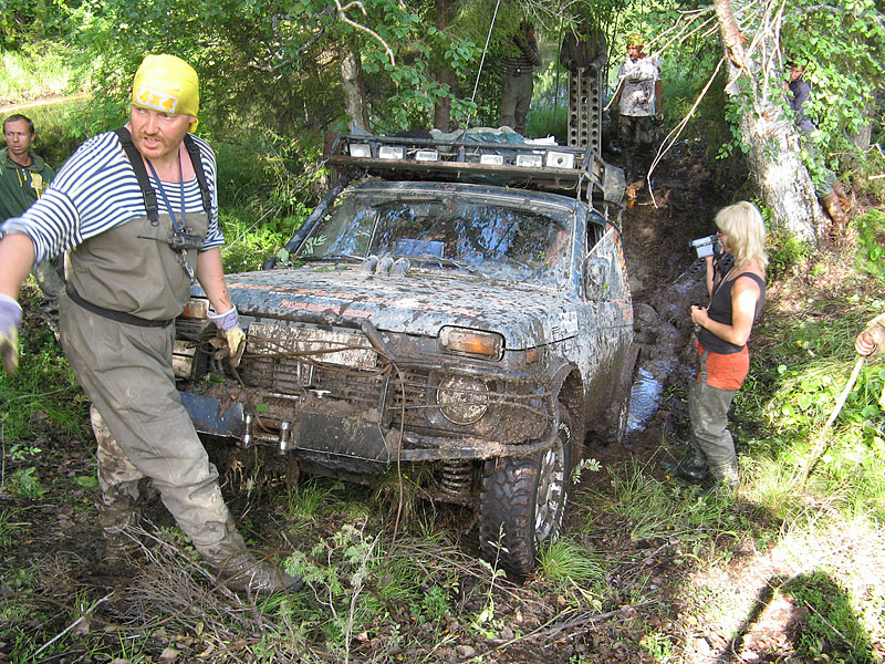 Но лебедочная помощь потребовалась не сразу: Живу единственному удалось попасть в траки и пройти ходом это место. Все-таки, гидроусилитель - вещь: позволяет быстро переложить руль, а вот Рейнжер и Хаха не успели, а длинная нива вообще просто не смогла вписаться в такую траекторию.