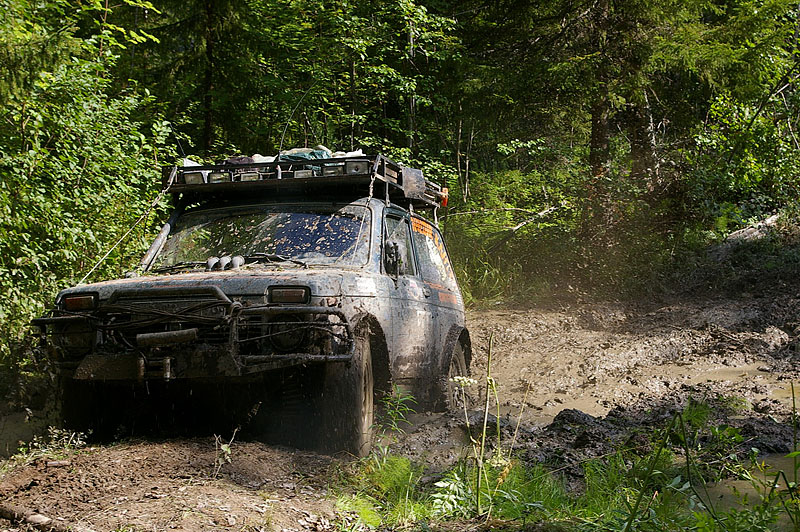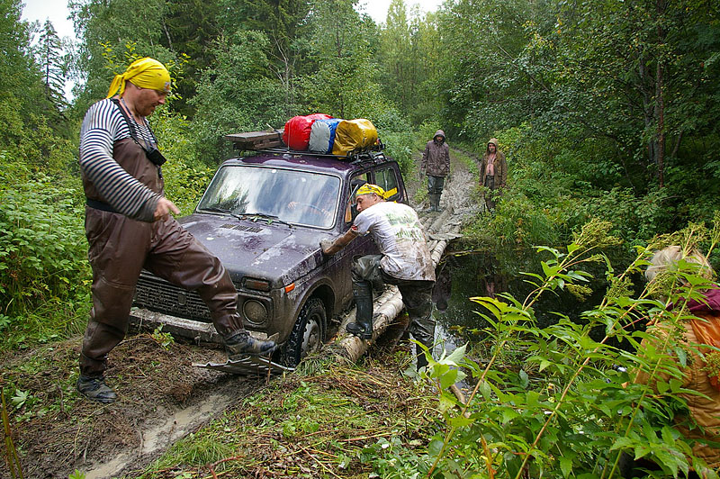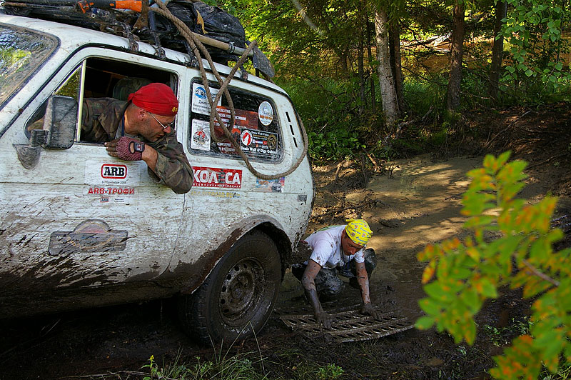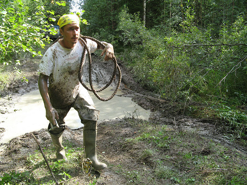 Нам казалось, что обратный путь по спец. участку окажется проще: во-первых, придется ехать по уже проверенной трассе, по известным траекториям, а во-вторых - днем. Конечно, нам удалось пройти этот спец. участок на час быстрее, но, все равно, по-быстрому проскакать не получилось - обратная дорога заняла более 6 часов и по сложности не уступала прямому направлению. Коррективу внес дождик и, в результате там, где мы два дня назад спокойно ехали, все машины постоянно падали в колею, соскальзывая по мокрой глине.