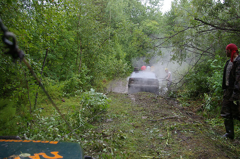 Как назло, начинается дождь. Еще пару раз пользуемся лебедкой. Вот и мост - за ним должна быть халява. Но тут случается еще одно неприятное событие... Традиционно ВЛИ-5 проваливаются между бревен. Рейнжер пытается слегка потянуть, не получается, а дернуть нельзя - у него сзади плохо с проушинами. Уступает место мне. Я дергаю... Как могу: иии... в заднюю дверь мне прилетает палец от шакла! Дверь всмятку, щели такие, что руку в багажник пропихнуть можно!