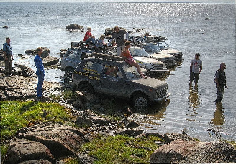 Поскольку внедорожные приключения, запланированные графиком рейда, уже закончились, а душа требовала продолжения, то утро началось с того, что мы решили-таки загнать машины в морскую воду, что с успехом и было притворено в жизнь. Но и этого оказалось мало: Жив с Рейнжером решили покататься по морским волнам "на камеру". Закончилось все тем, что у Жива отказало сцепление. К обеду мы-таки собрались в город: Жив - на веревке за уже отремонтированным Ужазиком, остальные - своим ходом...