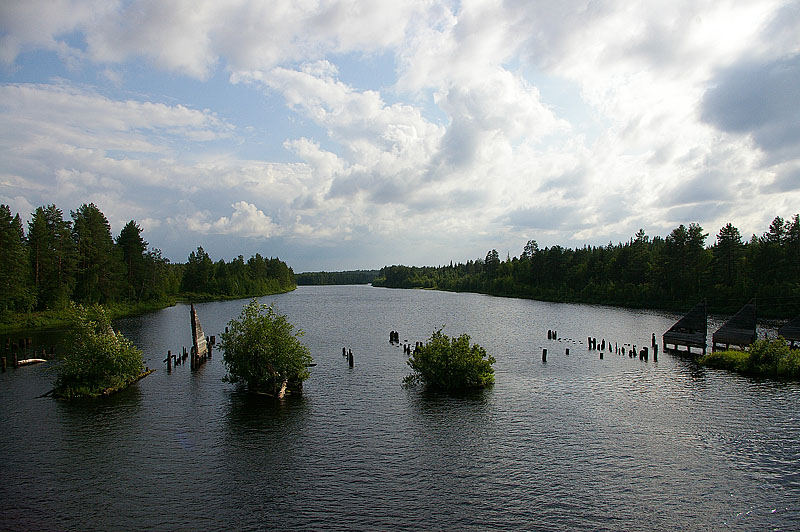 Сия пророчествующая информация дошла до меня только лишь после того, как мы тронулись и взяли курс дальше на север. Приходило на ум лишь одно - то, что речь идет о 6ти пролётном мосте через реку Выг, который в 2006 году был в аварийном состоянии, о чем гласили таблички и знаки, запрещающие движение более, чем одной машине. В общем, мне было о чем подумать... В голове крутилась карта, которую я изучал долгими зимними вечерами и ни к каким хорошим выводам я прийти не мог. Начал продумывать варианты альтернативной поездки с отменой Осударевой дороги. Спустя пол часа еще раз запросил по рации москвичей, что именно сказал этот товарищ, и москвичи мне поведали, что он делал остановку на Шелтопороге. Стоп! Шелтопорог уже за мостом через Выг! Москвичи помялись и сказали, что может быть, он сказал, что не стоял на Шелтопороге, а собирался делать там стоянку. В общем, ничего не понятно... Принимаю решение - едем по маршруту и разбираемся на месте.