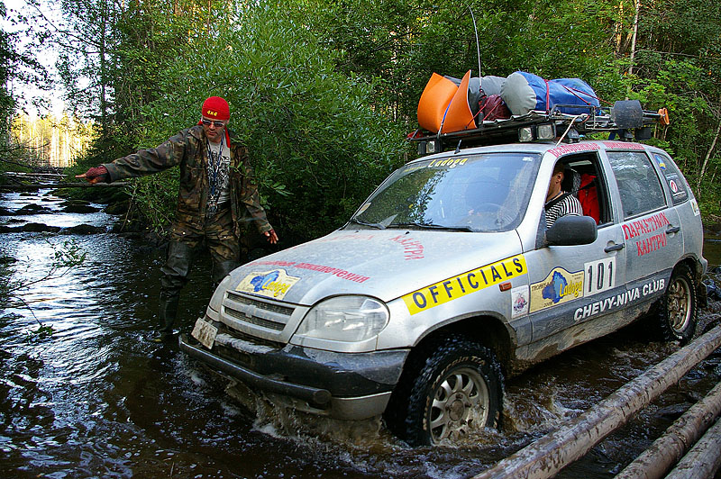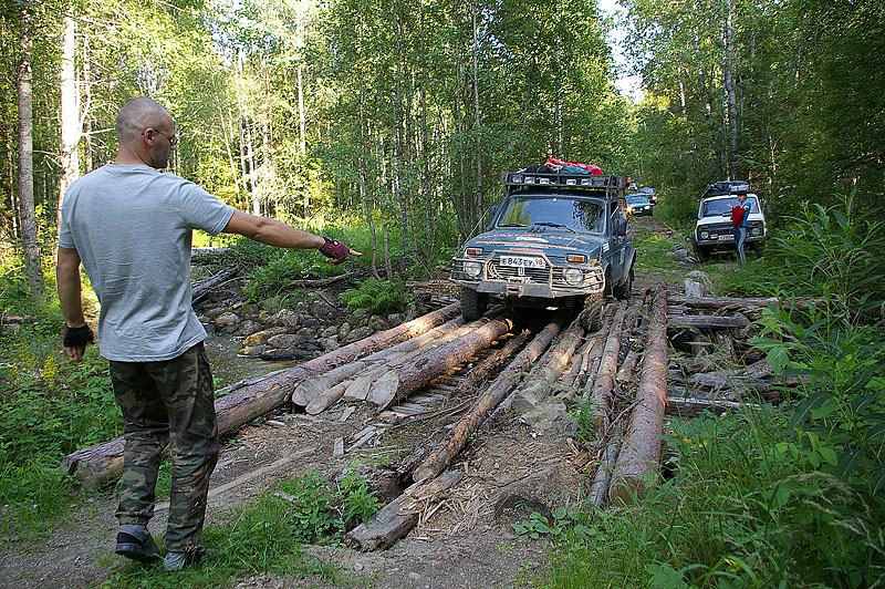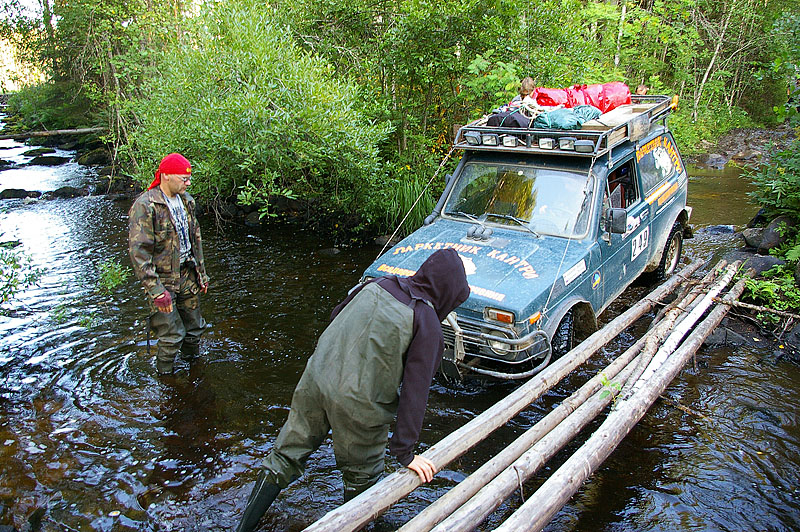 Промеряем глубину - в самом глубоком месте - по колено! Дааа. Если этот мост стал препятствием для подмосковного Алюляя, встретившегося нам в Пудоже, то по каким же грязям он на своем подготовленном болиде рассекает? Ему же здесь и до ступицы не дотянет. Если судить по тому, как быстро он обогнал нас на асфальте, то это новомодный московский тюнинг для стрит рейса.