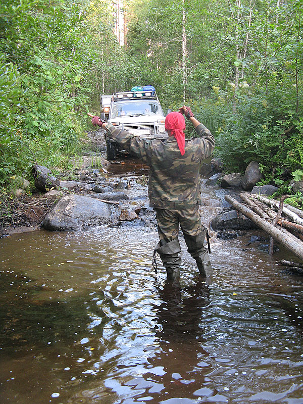 Движемся дальше. Арьергард вот-вот нас настигнет... Опа.... Приехали... А в 2006ом здесь был мост! Мы на него еще траки клали, чтобы колеса между подгнивших балок не провалились... Рядом проложен очевидный брод, достаем сапоги - начинается оффроад!