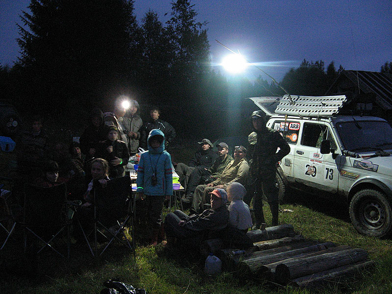 Кто читал отчет по рейду 2008 года, должен помнить - я рассказывал об особенности Жива засыпать и не замечать, что он спал. На сей раз мы его поймали "с поличным". Было у нас некоторое количество сосисок, то ли из города еще не съели, то ли в Пудоже купили... Решили мы их пожарить на ужин. Жива посадили ответственным по сосискам - решетку переворачивать, а он взял и традиционно заснул в кресле. Сосискам сгореть конечно не дали, вовремя перевернули, и даже съесть успели, решетку на мангал вернули, чтобы жир обгорел. Жив все спал, а участники рейда делились впечатлениями от первого дня оффроада и кто-то в пылу рассказа своих приключений помянул его. Жив тут же проснулся и откликнулся. Все обернувшись увидели как Жив исполнил свой долг - перевернул пустую решетку на потухшем мангале и сказал свою традиционную, для таких случаев, фразу: "Я не спал!"...