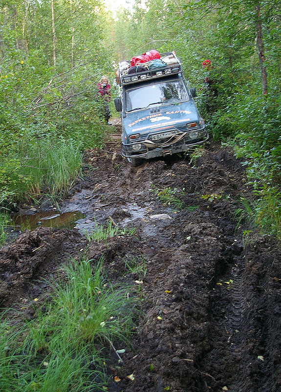 В путь! Выкинув мусорные пакеты в баки, стоящие вдоль дороги, мы быстро долетели до базы МЧС и приступили к первым не запланированным грязевым ваннам. Вся та мелкодисперсная пыль, витавшая в воздухе три дня назад, впитала в себя воду, низвергшуюся с небес, и превратилась в отменную чачу глубиной по ступицу. Машины, правда, без труда бодро ехали, и весьма не скупо наносили эту грязь на свои борта. Доехав до асфальта и сделав 10 минутный перерыв на подкачку колес, мы двинулись дальше - впереди нас ждал город Пудож, его магазины и бензоколонка.