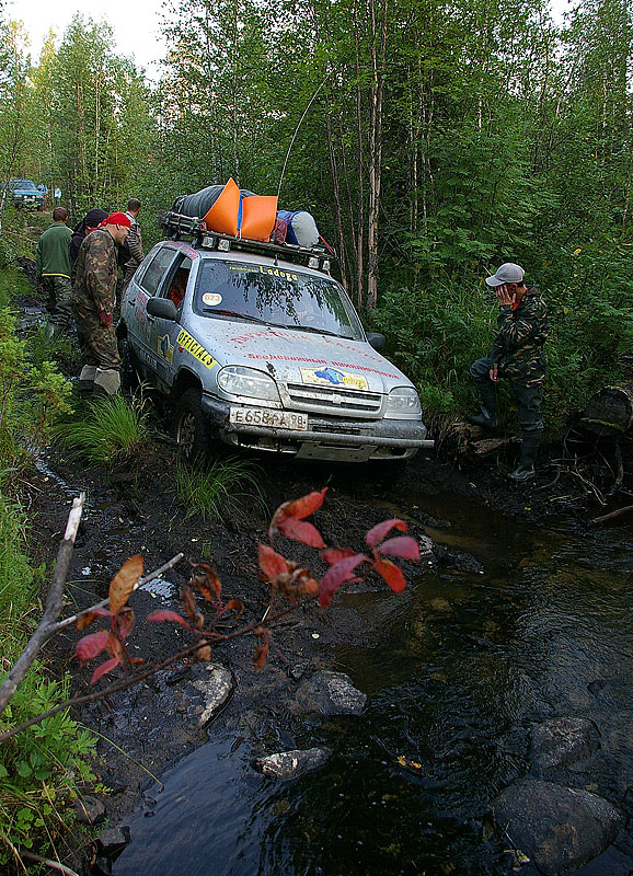 Наше путешествие по Выгорецким землям достаточно быстро прервалось вынужденной остановкой - на каменистом участке дороги длинная Нива, разведя колеса в разные стороны, ехать дальше отказалась, как бы сообщая всем своим видом известную фразу из анекдота: "Ну не смогла я!". Игорь, извергая проклятья в сторону РТЦ "Нива", в котором перед самым рейдом его машина проходила обслуживание (в том числе и развал-схождение), достает разорванную муфту регулировки рулевых наконечников. По характеру повреждений видно, что муфта была неправильно установлена - закручена "на одну сторону". Смысла стоять всей колонне не видим, поэтому выдав необходимые зап.части отправляемся дальше до лесопункта Тайгиницы, где планируется пополнить запасы питьевой воды.