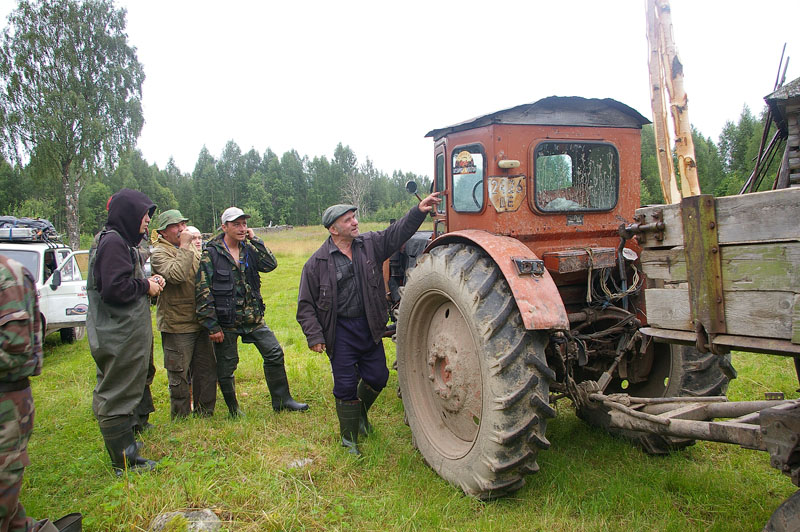 К тому времени. как мост был прикручен, а Хаха уже собралась - голова колонны прошла несколько засадных мест и расселась в одном из них. В гости зашел "хозяин горы", посочувствовал, что нам будет тяжело на таких низких машинах, но от предположений, что мы не пройдем на Петровский Ям воздержался и пригласил посетить единственную избу, сохранившуюся от поселка, в которой он проживает.