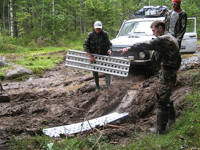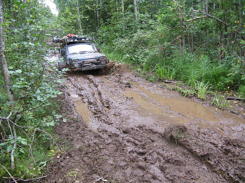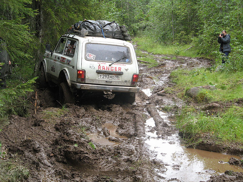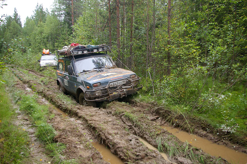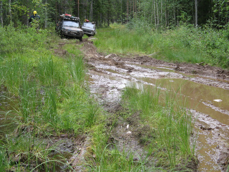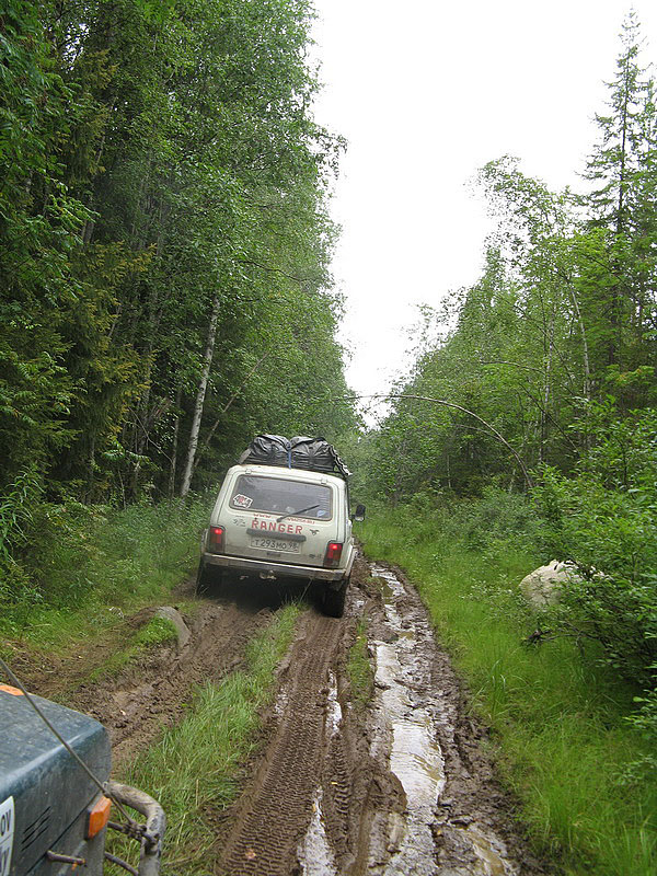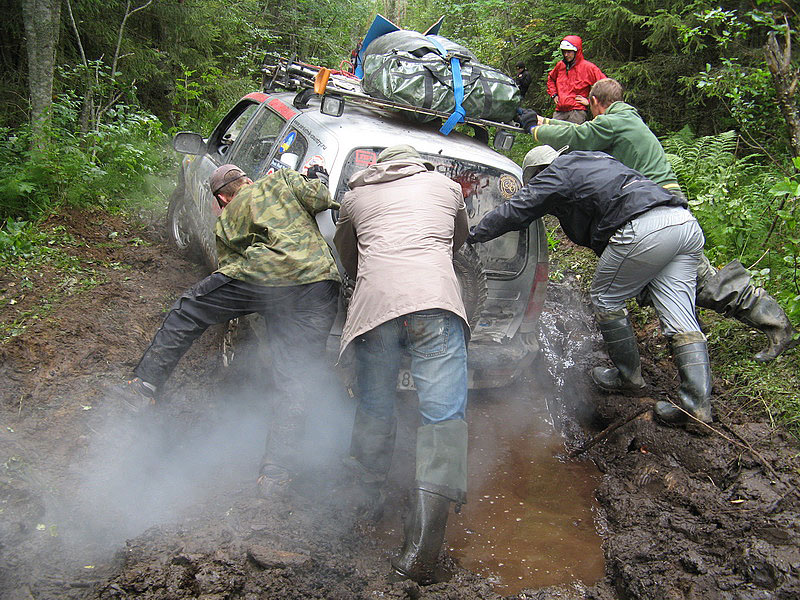 Оказалось, что провод от генератора упал на шкив помпы и полностью выгорела силовая часть. Короткое совещание о том, что у нас есть для ремонта и, что делать дальше; и я отправляюсь за необходимыми проводами. Как назло, этот чемодан запрятан в самую глубину багажника. Оставляем чиниться Опанек и Ренжера, а сами продолжаем штурмовать грязи - впереди нас ждал последний "расколбас" - около 100 метров болота и на выходе из него колея с огромными валунами.