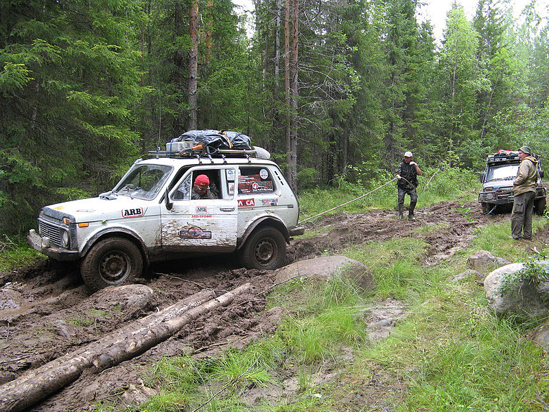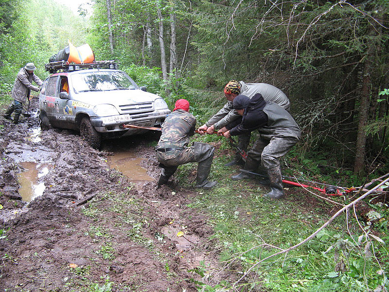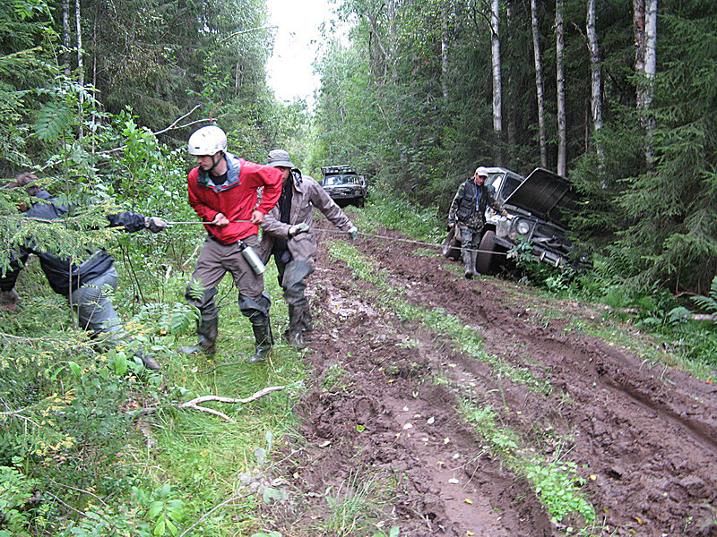 День, как обычно, начался с режимного подъема. Ремонтровать мою машину всей компанией смысла не имело, поэтому после завтрака назначаю старшим колонны Жива и отправляю разбираться со спец участком. Сам же, с Ranger'ом начинаю воплощать хитрую кинематическую схему по оттягиванию заднего моста через два блока, дерево и машину Ranger'a назад своей же собственной лебедкой. Основная часть участников, которая должна была уже давно уехать, почему-то топчется вокруг и дает советы. Оказывается, как обычно, не успевает собраться Хаха и все стоят ее ждут. Приходится отправить авангард вперед, а Хаху повесить себе на шею - понимаю, что, как планировалось, по-быстрому в две машины догнать остальных участников не удастся.