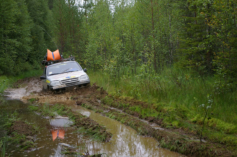 Ну что ж, "тапку в пол и пошел"! Мотор надрывисто рычит, в небо взмывается болотный мох. Уже в самом конце после болота наступает расслабление: все, болото прошел - дальше халява. За что и поплатился, упав в колею. Так и надо. Быстро цепляем трос, вытягиваемся.