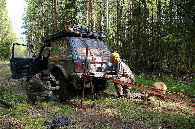 Выехать пораньше - в 10 часов - нам, конечно, не удалось: опоздание составило 45 минут. Зато первую часть спец. участка мы буквально пролетели не выходя из машин. Лишь пару раз остановились вынуть из подвески попавшие туда бревна. Проблемы начались в конце спец. Участка и по дороге на Валдай: сначала встала весьма надолго московская шнива (честно говоря, не знаю, что у них случилось), потом Жив наспех прикручивал стяжками к крыше оторвавшийся багажник. Чуть дальше настала моя очередь воевать с глушителем, который в буквальном смысле намотался на колесо. Разматывали при помощи 2х хай-джеков и другого автомобиля. И, наконец, сорвало вторую муфту регулировки сходимости на длинной Ниве. Ко всему этому добавилось вполне себе такое не асфальтовое покрытие дороги ВорожГора - Валдай, которое, как я ожидал, должно было быть полегче.