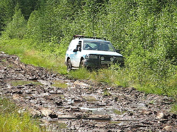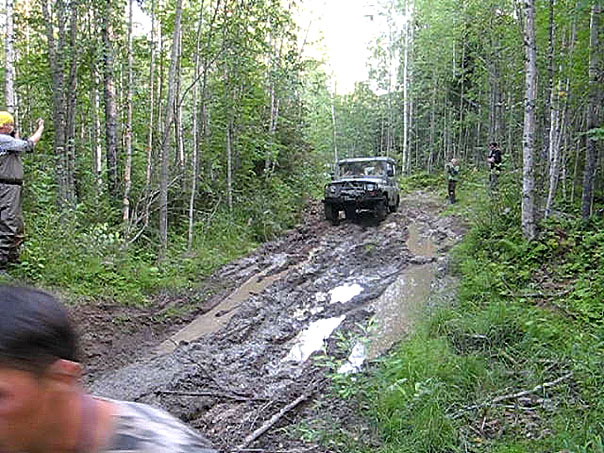 Привал на обед мы устроили у припаркованной в лесу, почти чистой, на шоссейной резине Нивы. Судя по ее виду, до Валдая должно было идти идеальное шоссе, но не тут-то было: впереди нас ждала очередная гать и даже кто-то из наших там сидел.