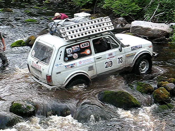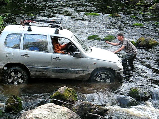 Халява! Это единственное, что я смог изречь, когда увидел предстоящий спец. участок - с 2006-го года много утекло не только воды, но и камней! Обещанная нам высокая вода едва скрывала ступицу нивы в самом глубоком месте. Мы неспешно одели резиновые сапоги и стали прогуливаться в поисках траектории, которая была очень быстро найдена. Единственным препятствием был камень на дне, на который надо было аккуратно наехать левым колесом. Гораздо страшнее выглядел подъем, следовавший за бродом. Я даже специально отъехал в сторону, на случай, если придется помогать лебедкой, но это не потребовалось. Я оказался в самом конце колонны, но на берег прекрасного Хижозера мне было суждено все равно выехать первым, благодаря тому, что некоторые участники нашего рейда, оказавшиеся во главе колонны, так торопились попасть на него, что проскочили нужный поворот на берег, который нас ждал всего в 100 метрах за спец. участком.