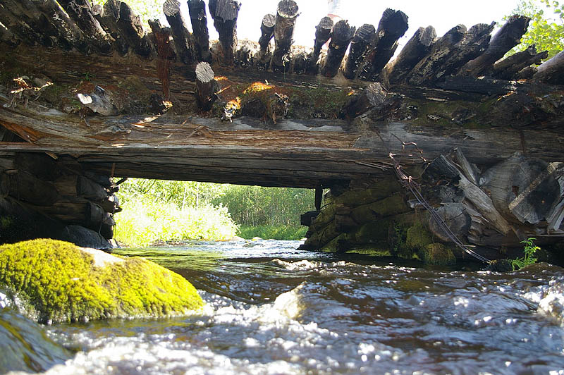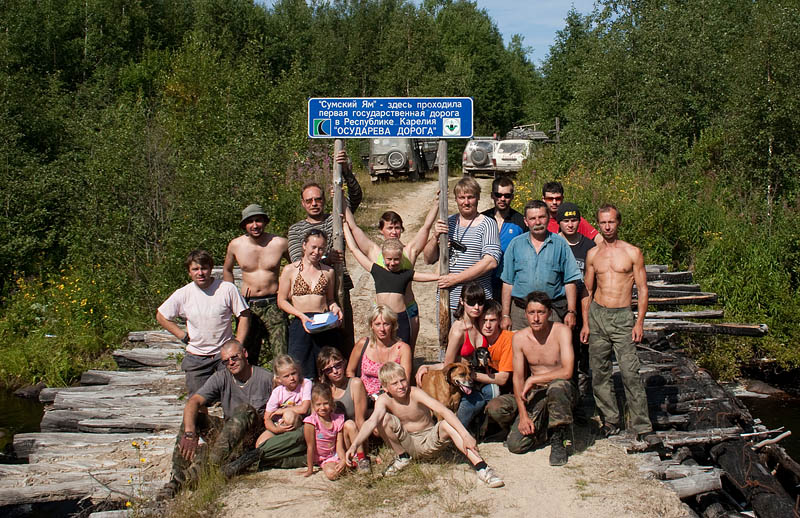 Решили, что заедем в Беломорске в ГИБДД и оформим. Едем дальше. Дорога веселая: болото, гать... На выходе с гати нас встречает лесник, который сообщил, что дальше мы фиг проедем, ибо они разобрали аварийный мост через реку. Мостов там много, в большинстве своем все небольшие. Выясняем где и думаем насколько реально пройти там вброд. В разговор подключается Рейнжер - его уже 2 раза обломали со строительством моста: сначала там, где московский Алюляй не проехал, а потом и на Руйге, несмотря на то, что я обещал, что уж там-то точно переправу придется наводить... В общем, Рейнжер с Живом обещают леснику построить мост за 2 часа, причем с перилами и разводной, коль уж мы из Петербурга. На что дядечка сказал: "Чур-чур вас, сказано: месяца два-три. И никак нельзя ранее, а то без работы останемся". И между дел пригрозил уголовной ответственностью за каждое спиленное дерево. Итак, не видать нам Патрикеевых Ламбин как своих ушей. Уж если мы поедем, этот точно за нами увяжется и будет следить, чтоб не дай бог чего не спилили. Зато на обратном пути оторвались: посадили две машины и разнесли всю гать по бревнышку. Лесник бегал и причитал, что теперь ему оттуда не выехать. Короче говоря, отомстили по-полной, может быть, теперь мост быстрее построит - дорога то в две стороны ведет!