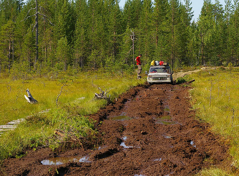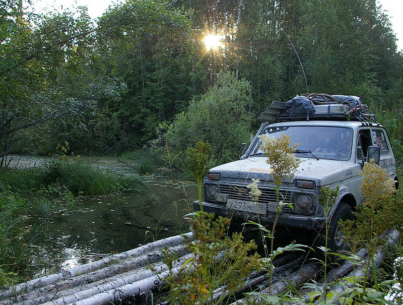 Пробуем. Сначала Жив, потом я - проходим ходом, Выдергиваю Опанек из ручья. В общем-то, смотреть хоть и есть на что, но надо двигаться дальше - черт знает, что там нас ожидает. Еду. Сначала аккуратно, через траву. Не видно ничего - трава выше капота, но направление понятно. Потом приходится добавлять газу - колеса начинают вязнуть. Через 200 метров уже иду "тапка в пол". Выскакиваю на небольшую возвышенность, тут же раздается сильный удар: сначала в переднюю балку, потом в раздатку, задний мост уже цепляет совсем слегка. Отчетливо слышны удары кардана по кузову при движении. Останавливаюсь, выхожу из машины. Под ногами твердо. Пытаюсь заглянуть под машину - безрезультатно, видно только лишь примятую траву. Если разбил раздатку, то машина отсюда не выедет, даже трактор не протянет. Прикидываю в уме экономическую целесообразность съездить в Беломорск за раздаткой и понимаю, что выгоднее будет машину здесь раздеть и бросить...