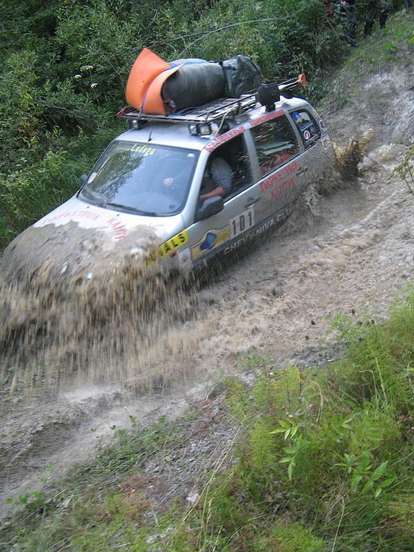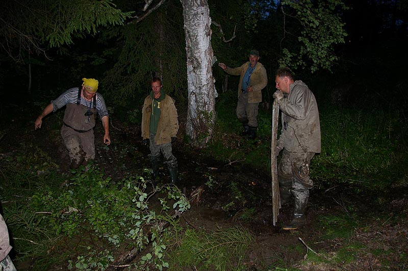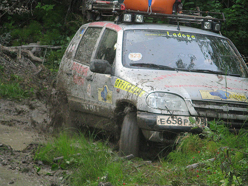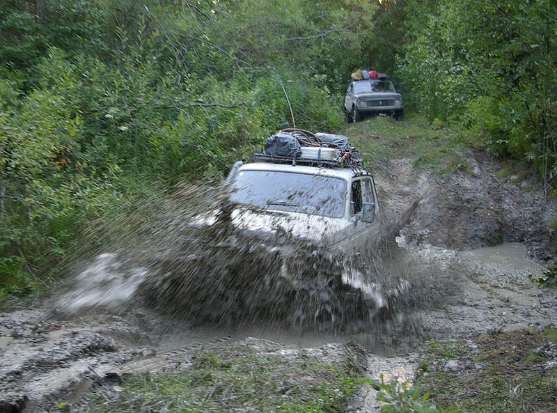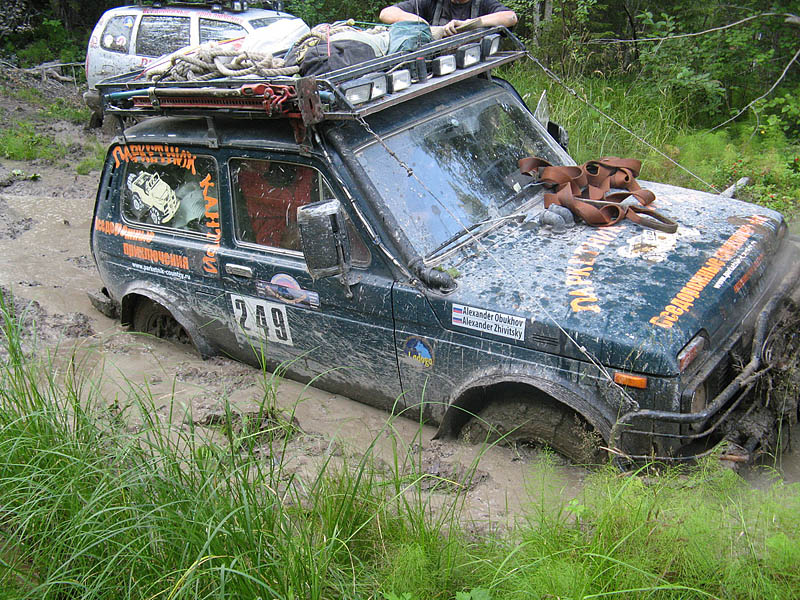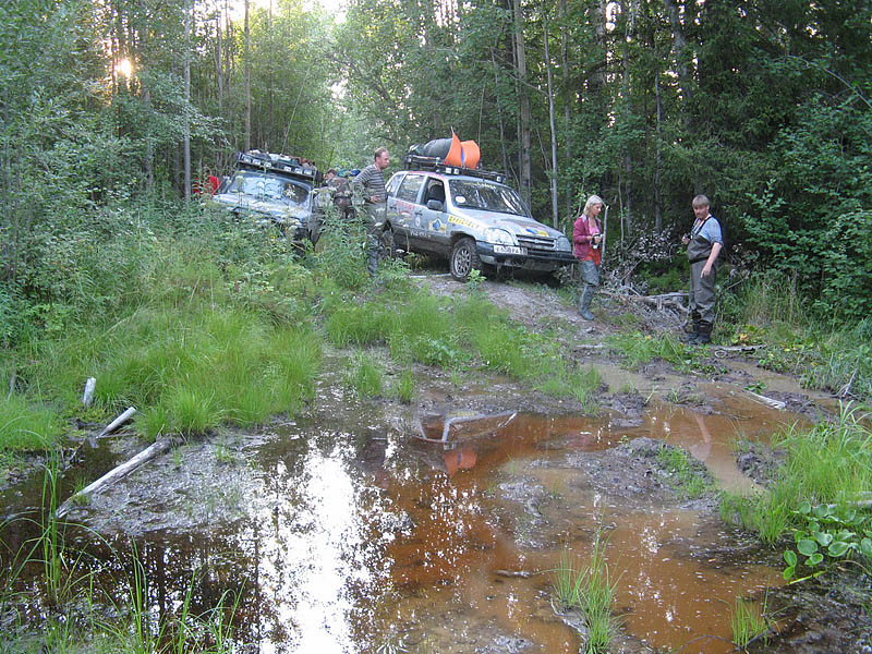 В 18.20 мы свернули с грейдера на дорогу, идущую вдоль Руйги. Достаточно бодро "проскакали" по кромке поля, на котором местные жители занимались заготовкой сена и въехали в лес. Сразу же началась глиняная колея, с большими лужами, хотя дождя не было уже несколько дней. Первая лужа, вторая, третья: Делаем остановку и переобуваемся в сапоги, заодно подтравливаем колеса. Лужи становятся все глубже. Жив улетает вперед, а я останавливаюсь поддернуть следующую за мной машину. По рации от Рейнжера идет коротко и лаконично: "Сполз в обрыв. Стою на тормозах. Могу свалиться в реку". Так, началось, дергать опасно - нужна лебедка. Проезжаю метров 100, прежде чем нахожу место для разворота. Пока разворачиваюсь и возвращаюсь, Рейнжера уже вынесли : на руках! Нет, всё-таки какой уникальный внедорожник - Нива. Может, в следующий раз рискнуть на Вардию на Нивах ?