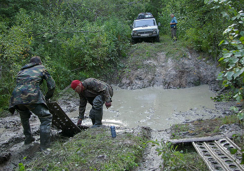 До моста через ручей, где большинство бросают машины и на море идут пешком - добрались быстро. Сам мост - "ни а чом": двигаем разъехавшиеся, забиваем пару скоб для верности - зачем народ тут ломился в брод по соседству, мне не понятно. Так же, для меня остается загадкой местонахождение "хорошего места для лагеря", которое мне посоветовали, чтобы оставить машины и дальше идти пешком. Поехали. После прохождения 2ой машины, на въезде и выезде подкладываем траки. Единственная сложность - это Нива на ВЛИ-5, они просто проваливаются между бревен - слишком узкие.