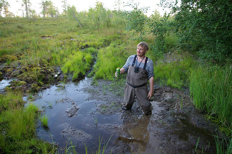 Далее болото подходит вплотную к дороге. Нам обещали, что дальше мы не проедем ни при каких раскладах, посмотрим... Идем пешком, изучаем следы. Очевидно, что кто-то ехал прямо по болоту, там, чуть выше. Дорога - сплошная топкая трясина, глубиной больше, чем по колено. О том, что здесь можно пройти без лебедки, даже думать не стоит. Затем вообще натуральный ручей. По болоту идти не рискуем - порядка 200 метров без возможности за что-либо лебедиться и возможности тащить другой машиной. Если засядем, то конкретно. Дальше, вроде как, дорога продолжается, правда, заросла напрочь и скорее представляет собой тропинку, но в траве отчетливо видна колея от машины.