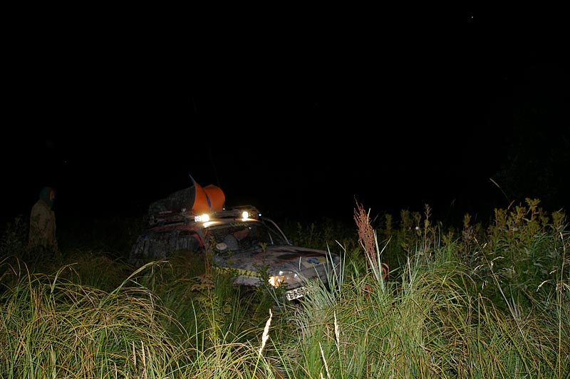Тут еще выясняется, что Хаха на ВЛИ-5х утонула. Стояла на твердом, а спустя несколько минут - уже "на мостах". Дернули. Дальше уже идем втроем перед первой машиной. Опушка леса за полем... Да, "расколбас" знатный. Решаем пройти сбоку: по кустам основная сложность - пройти по правильной траектории, да еще и ходом. Не видно ничего! Абсолютно! Типичное объяснение штурмана пилоту: "Сейчас вон на те кусты, а затем налево, вон на тот фонарик, который не мигает - это Жив, он отпрыгнет, только вон, видишь: справа фонарик мигает - это дерево, туда не надо, а слева фонарик мигает - это камень!". Пилот обычно говорит: "Ага, понял" и, зажмурившись, "тапка в пол"...