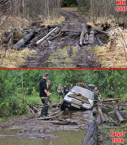 Исходя из всего этого сложность туристической поездки никогда нельзя определить заранее, слишком много факторов влияющих на изменение ситуации. Ну и в завершении немного картинок, чтобы подкрепить мои слова конкретным материалом. Это дорога на Бесов Нос. Мне удалось побывать там трижды, и каждый раз она была абсолютно разной и непредсказуемой, даже весной 2007 года, в мае, в самое половодье она была намного легче, чем казалось бы не слишком дождливым летом 2008 года: